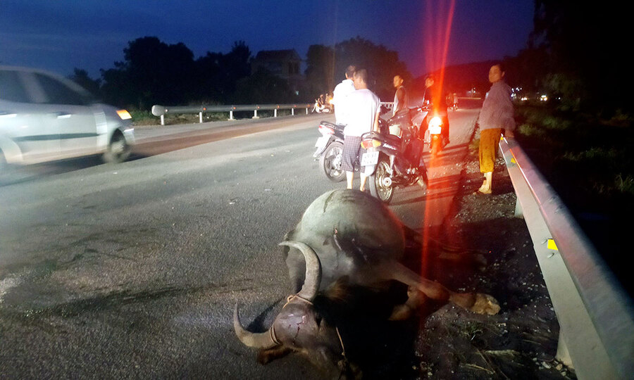 Túi khí ô tô 5 chỗ bung sau khi tông vào trâu. Ảnh: Hồng Lê-Công an huyện Nghi Xuân có mặt để giải tỏa giao thông, làm việc với những người liên quan vụ tai nạn, điều tra làm rõ nguyên nhân. -Năm 2017 và 2018, Hà Tĩnh thường xảy ra vụ tai nạn chết người do các nguyên nhân sau Đàn bò trên đường cao tốc. Tỉnh đã giao quyền lãnh đạo các cấp giám sát, xử lý nghiêm các cá nhân, gia đình, tổ chức thả rông gia súc trên đường bộ, đường sắt. Chủ tịch các huyện, thị xã, thành phố phải chịu trách nhiệm. Nếu để xảy ra tình trạng trâu, bò húc nhau sẽ gây xáo trộn giao thông, mất an toàn, vệ sinh môi trường và mỹ quan đô thị.