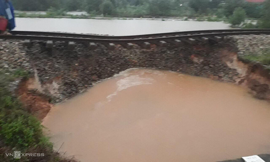Cục Đường sắt cho biết, khu vực ngập lụt nằm dưới chân đường sắt, giữa ga Guangsan và Đan Sơn, khu vực sạt lở rộng khoảng 5-6m, rộng 2-3m. Mét sâu. Tuyến đường sắt bị sạt lở sâu khoảng 3m khiến tuyến đường sắt bắc nam bị ách tắc. Ảnh: Thành Long – Ông Lê Hồng Hải, Giám đốc Công ty cổ phần Đường sắt Bình Trị Thiên cho biết, 80 công nhân đã có mặt tại hiện trường, ném đá khôi phục lại tuyến đường và lên phương án thông đường. Bây giờ là mười hai giờ. Chiều nay.