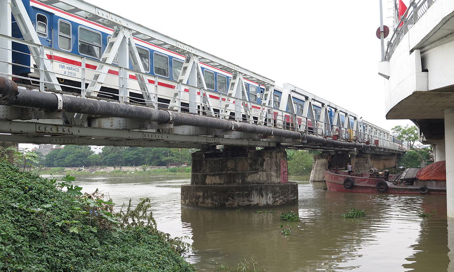 Các chuyến tàu chở hàng đi qua Cầu Đường sắt Tambak, và các toa tàu nằm gần cầu. Ảnh: Giang Chinh