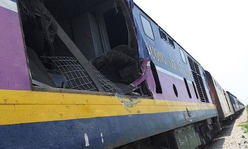 Lúc 11 giờ sáng ngày 20/4, đoàn tàu khách SE8 đến địa phận xã Diễn Hồng (Diễn Châu, Nghệ An) thì va chạm với một xe tải đang băng qua đường. Xe tải bị tông cách mép đường ray khoảng 3m, phần đầu xe lộn xộn, tài xế 23 tuổi đến từ đường Kun’an (huyện Ngee’an) tử vong tại chỗ. Xe khách đầu máy trật khỏi ray, nhưng không ai bị thương. Nhiều thanh giằng bị hư hỏng dưới đường ray. Ảnh: Xuanwan .