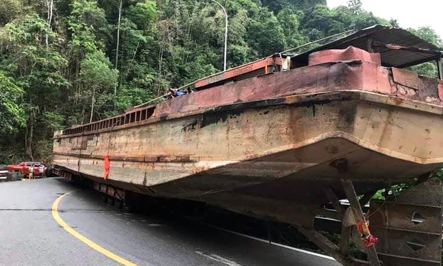 Con thuyền dài đến mức mỗi khi xe kéo quay đầu sẽ gây tắc đường ở đèo Baolu. Ảnh: Hoài Thanh .