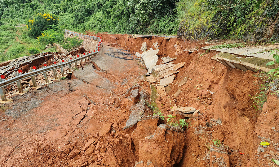 Đường vào khu du lịch Danong bị sạt lở gây quán tính. trụ cột. Ảnh: Ngọc Oanh.