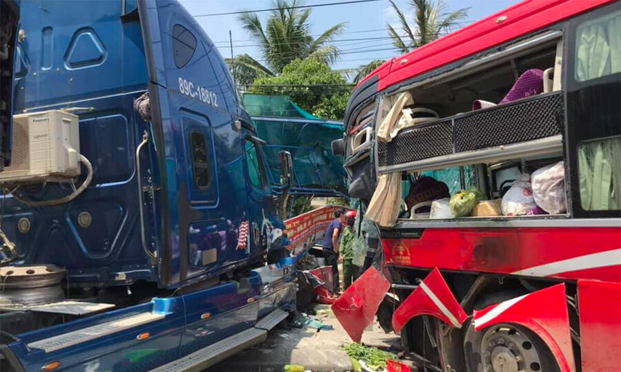 hiện trường vụ tai nạn. Ảnh: Đức Hùng Vào khoảng 10h ngày 10/5, xe container Hồng Én lưu thông trên QL1A theo hướng Bắc – Nam. Khi đến ngã tư Voi, thành phố Kipen, huyện Tế An, xe container húc vào xe khách Thanh Hóa đang lưu thông theo hướng ngược lại. Theo hướng Bắc – Nam, một phụ nữ đón xe tử vong ở Đắk Lắk đã làm hư hỏng bức tường của trường THPT Nguyễn Huệ.