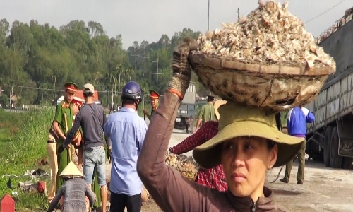 Khi hơn 15 chiến sĩ trong cùng một nhà xe đang nhặt củ mì và gỡ mì hỏng bên đường để tránh nguy hiểm cho giao thông thì một số người dân và người đi đường cũng chạy đến kêu cứu. . -Với sự giúp đỡ của nhiều người, hàng bún đã nhanh chóng được dọn sạch. Con đường này chỉ mở sau 4 giờ.