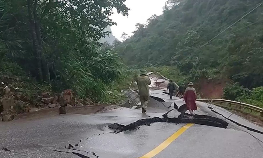Đường 12A bị đứt gãy do sạt lở. Ảnh: Hoàng Apple .