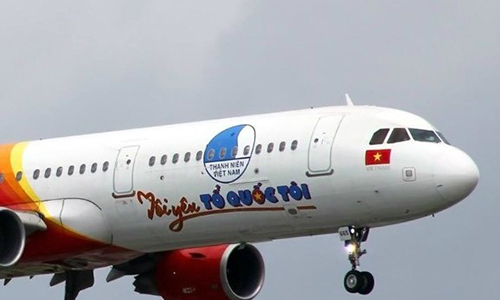 Chuyến bay VIetjet với biểu tượng “Tôi yêu quê hương đất nước” chào đón các cầu thủ về nước.