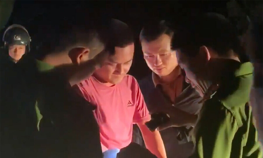 Tài xế (áo hồng) bị cảnh sát tạm giữ. Ảnh: Gia Hân-Khoảng 9 giờ tối, tổ tuần tra, kiểm soát thuộc Đội Cảnh sát giao thông Công an huyện Tương Dương làm nhiệm vụ kiểm tra các phương tiện lưu thông qua thị trấn Bảo Châu trên quốc lộ 8A. Đoàn xe yêu cầu dừng xe ô tô 5 chỗ do Phi điều khiển.