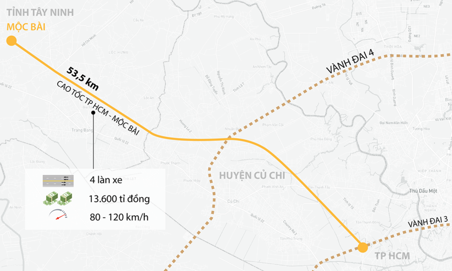 Đường cao tốc Thành phố Hồ Chí Minh – Mộc Bài dài 53 km, bắt đầu từ nút giao với đường vành đai 3 và kết thúc tại Ninh, khu kinh tế Mộc Bài (tỉnh Thái Lan). Tuyến đường này có quy mô 4 làn xe (giai đoạn 1 là 17m), dự kiến đưa vào sử dụng năm 2025. Tổng diện tích của dự án là 432 ha, TP.HCM chỉ chiếm 209 ha, còn lại là ở Đà Ninh. – Dự án được thực hiện theo hình thức đối tác công tư (PPP), BOT (xây dựng-kinh doanh-chuyển giao). Thời gian hoàn vốn (không bao gồm vốn nhà nước hỗ trợ dự án) dự kiến là 23 năm 8 tháng kể từ khi đưa dự án vào sử dụng.
