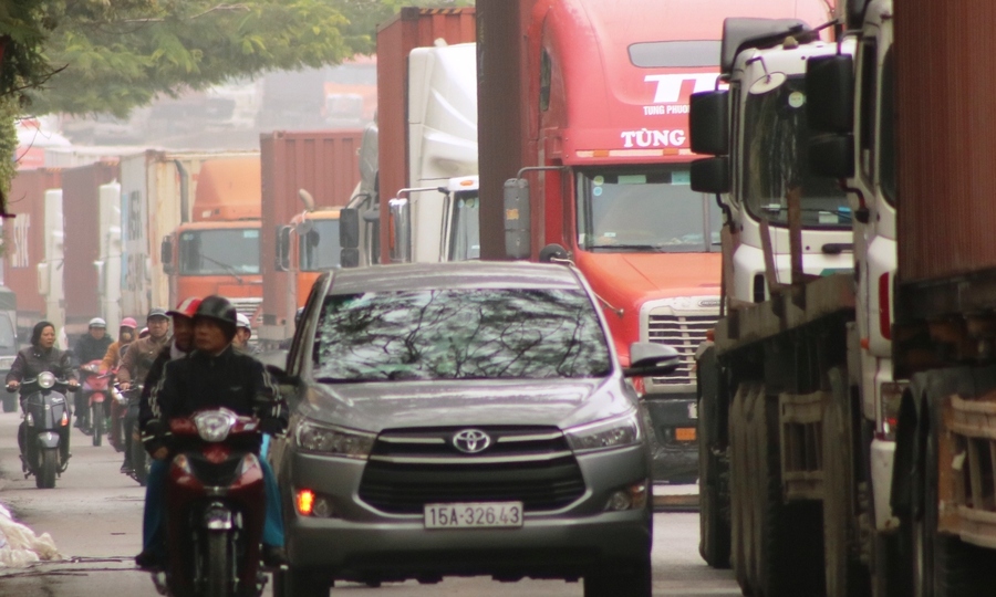 Một dãy container xếp thành 2-3 hàng ngang đã được lấp đầy. Con đường chạy dọc theo hướng cảng Hải Phòng, Hà Nội khoảng 15 km, chỉ chừa một khoảng trống nhỏ cho các phương tiện khác đi qua.