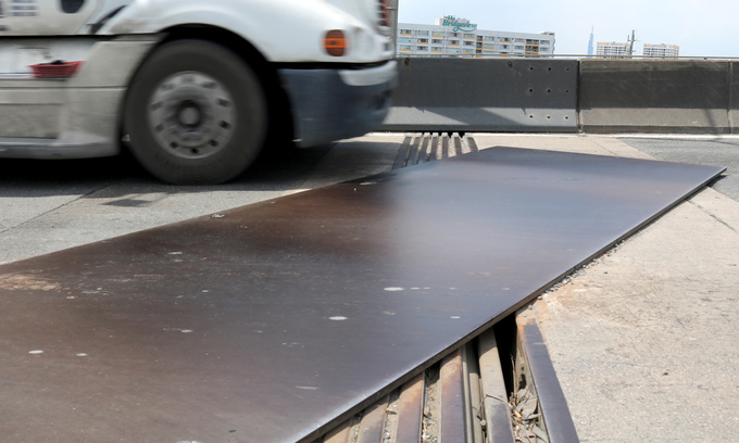 Do khe co giãn bị hư hỏng nên ngày 10/9 đã đặt thép bảo vệ tạm thời. Ảnh: Gia Minh.