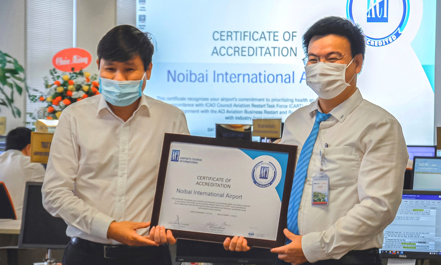 Chứng chỉ AHA do Hội đồng Sân bay Quốc tế (ACI) cấp công nhận việc đảm bảo an toàn, vệ sinh và dịch tễ tại Sân bay Nội Bài trong thời hạn 12 tháng kể từ ngày 24/11. Các yếu tố được ACI đánh giá bao gồm: quy trình làm sạch và khử trùng, đo khoảng thời gian, kế hoạch bảo vệ sức khỏe nhân viên, phương pháp giao tiếp với hành khách, trang thiết bị hành khách … Một chứng chỉ đã được cấp. Ảnh: NIA .