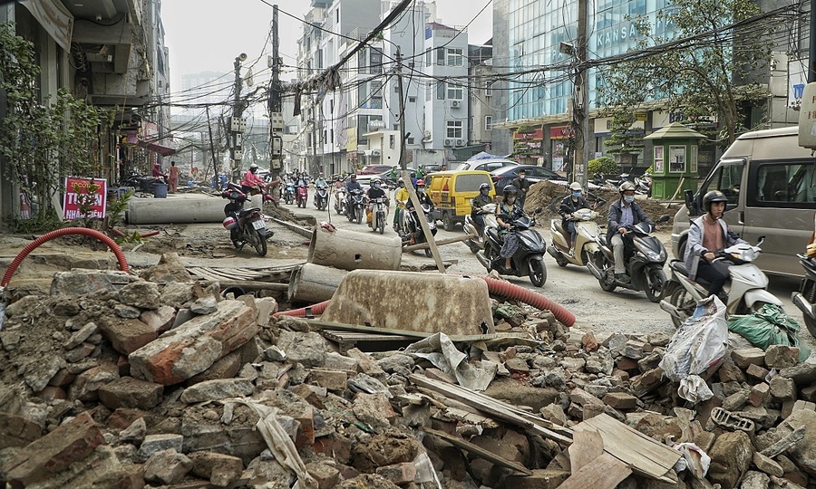 Mỗi ngày hai lần đi lại trên con đường này, anh Ruan Antu (năm nay 36 tuổi, phường Thanh Xuân, TP. Hà Nội) Từ khi dự án khởi công (tháng 4/2019), đã có thông tin “giao thông ngày càng xuống cấp”. “Trước đây, đường Vũ Trọng Phụng giờ cao điểm vẫn đông nhưng không bụi như bây giờ, giờ mỗi lần đi lại thấy phiền phức”, anh Tú nói. — Vật liệu xây dựng ngổn ngang trên đường Vũ Trọng Phụng. Ảnh: Phạm Tuân-Trong tháng qua, vỉa hè trên đường Vũ Trọng Phụng được đào xới để nhà thầu lắp đặt đường ống. Nhiều gia đình đi đường phải dựng cầu gỗ trên vỉa hè dài để đi lại.