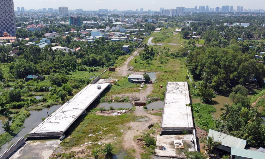 Đây là một trong 4 phần dở dang của dự án Vành đai 2 TP.HCM, được khởi công vào cuối năm 2017 với tổng vốn đầu tư hơn 2,5 nghìn tỷ đồng. Trong đó, chi phí thu dọn hiện trường 1,410 tỷ đồng, được quận Thủ Đức chia thành dự án riêng. Công ty cổ phần Văn Phú Bác Ái đầu tư dự án đầu tư BT (Chuyển giao công trình) 4 đoạn Vành đai 2 với tổng chiều dài hơn 14 km vẫn chưa được đóng thầu. Đồ họa: Thanh Huyền.