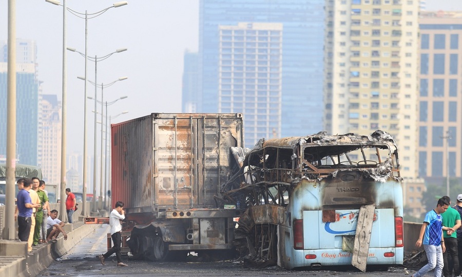 Lúc 4 giờ sáng 11/7, xe khách 45 chỗ chạy từ quốc lộ 3 về hướng Cầu Giấy, đến đoạn gần Trung tâm Hội nghị Quốc gia thì tông vào đuôi xe tải. -thùng đựng hàng. Vụ va chạm nghiêm trọng khiến phần đầu xe khách bẹp dúm, bốc cháy ngùn ngụt. Cú tông vào đuôi xe container. Một vụ tai nạn lớn khiến đầu người ngồi trên xe bẹp dúm và bốc cháy.