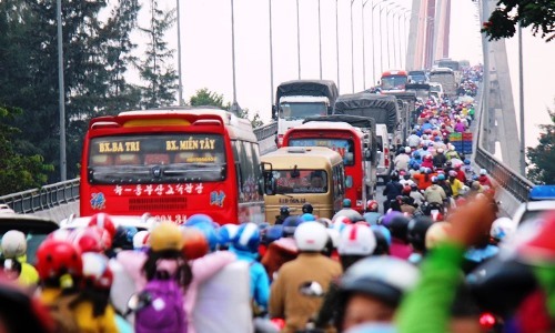 Trạm BOT cầu Rạch Miễu đã dừng thu phí từ 12h trưa 10/2, nhưng do kẹt xe, mặt cầu hẹp khiến giao thông từ cầu Rạch Miễu đến cầu Bà Rịa bị ùn tắc nghiêm trọng kéo dài 5 km. Hầu hết xe của người dân về quê, xe tải chở hàng hóa, cây cảnh từ các tỉnh miền Tây chở về TP.HCM.