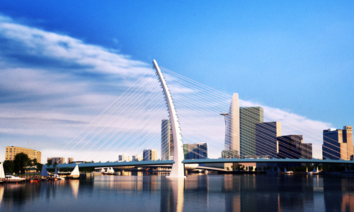 Phối cảnh Cầu Thủ Thiêm 2 kết nối Khu 1 và Khu 2. Nút giao thông Tôn Đức Thắng – Lê Duẩn (Khu 1) chạy dọc theo đường Tôn Đức Thắng, vượt sông Sài Gòn, nối từ Thủ Thiêm (Khu 2) đến Đại lộ Vọng Cung (Quốc lộ R1) trong thành phố mới.