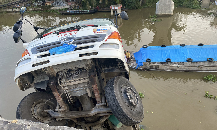Khuya 29/11, tài xế Ruan Wenshun (42 tuổi, An Giang) điều khiển xe tải chở gạo từ Dongta đến Tian Jiang. Khi xe qua cầu Thiên Hà trên kênh Nguyễn Văn Thip (Thiên Giang, Caibei), nhịp giữa cầu dài khoảng 50 m bất ngờ đổ sập. Chiếc xe tải bị ngã, đầu bị cuốn vào gầm cầu. Cầu thoát hiểm – Cầu Thiên Hà dài khoảng 100m, rộng 4m, nối xã Hậu Mỹ Bắc A với xã Hậu Bắc B, huyện Cái Bè, có lịch sử hơn 4 năm, kinh phí hơn 10 tỷ đồng. Cầu chỉ cho xe tải 3,5 tấn đi qua, nhưng xe tải trên 15 tấn chở hàng – đầu xe nằm chắn ngang mặt cầu. Ảnh: Hunan.