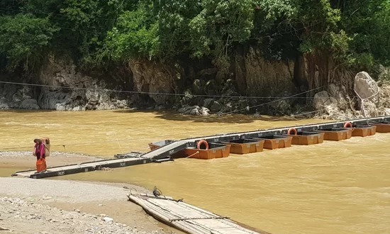 Từ ngày 7 tháng 8, Quốc lộ 16 hoặc Tỉnh lộ 521D từ huyện Quanhe đến xã Mengli. -Chính giải phóng khỏi vùng biên giới này. – Di chuyển máy xúc, mở đường vào thị trấn Meng Lat. Ảnh: Lin Song. – – Làng Sana (TP. Thanh Hóa) thuộc xã Nammo, huyện Quansong – cũng bị cách ly trong đợt mưa lũ vừa qua, Lữ đoàn Công binh 141 (Quân khu 4) vận hành thiết bị vận chuyển đến Trên bờ sông Luang ở làng Bo, một cây cầu phao tạm được xây dựng bắc qua sông. Cầu phao dài 30 m giúp lực lượng cứu hộ vận chuyển lô hàng hóa, thuốc men đầu tiên về bản, từ cầu phao, bộ đội và cán bộ phải đi gần 2 km mới đến được bản Sa Na. Ảnh: Linzi