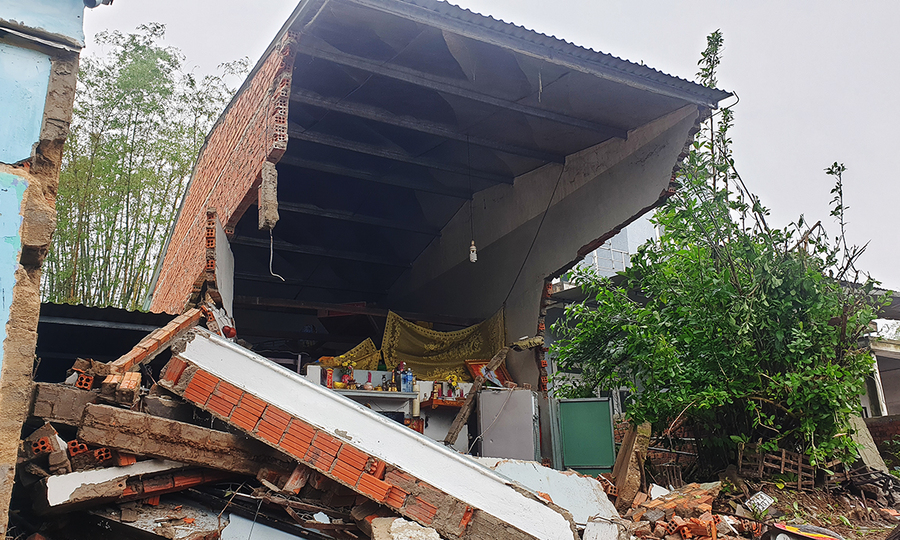 Một căn nhà bị sập, 6 căn nhà còn lại và 5 xe máy dựng trên vỉa hè bị hư hỏng, rất may không có ai bị thương.