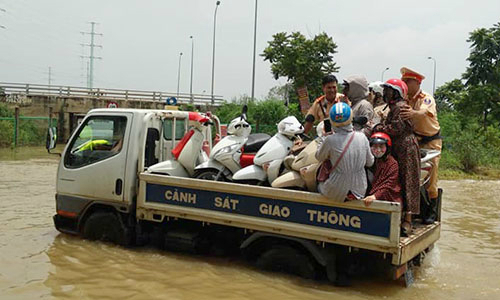 Tại nhiều vị trí bị ngập, cảnh sát giao thông Hà Nội đã tổ chức đội chốt chặn xe cẩu. Ngoài ra, các đội CSGT số 11 và 12 đã làm việc với Cảnh sát khu vực Quốc Oai, điều động 3 xe tải để chở người và xe máy qua đoạn ngập khoảng 400m. Dài. Cảnh sát giao thông Hà Nội chở người qua điểm ngập. Ảnh: Sun Duong