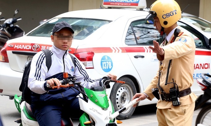 Cảnh sát giao thông Hà Nội và tài xế học sinh đã vi phạm quy định về lưu thông động cơ điện. Ảnh: Phương Sơn
