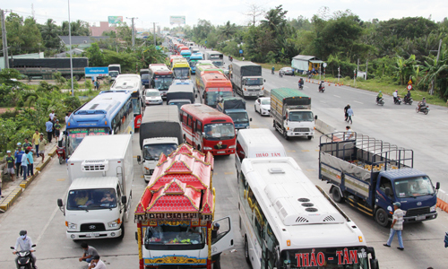 Thời gian gần đây, giao thông trên quốc lộ 1A đoạn qua BOT Sóc Trăng thuộc thị trấn Hiệp, huyện Châu Trang bị tê liệt. Nhiếp ảnh: Phúc Hưng.