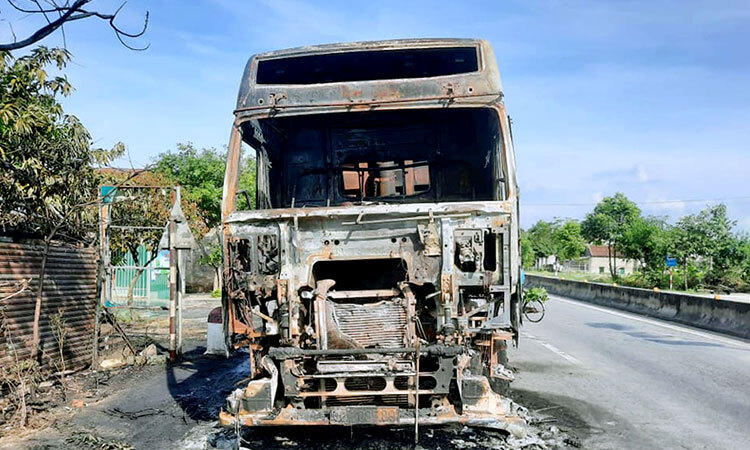 Tại hiện trường, phần đầu xe trơ trọi, vô số bánh xe nổ tung. Thân xe bị thổi bay, xung quanh xuất hiện khói đen. Nhiếp ảnh: Hùng Lê