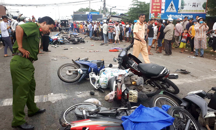 Tại hiện trường, gần 20 người nằm liệt và 3 người tử vong tại chỗ. 21 chiếc xe máy bị biến dạng. Nhiều xe máy bị đập vỡ làm đôi, chồng chất lên nhau, dầu nhớt chảy tràn. Một số xe máy bị kẹt cứng dưới gầm xe container.