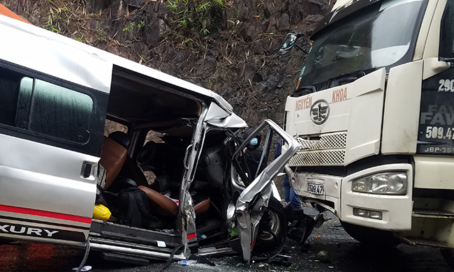 Tài xế của Qinghong đã đạt km 12 + 400 khi đi qua quận Hồng Hà và cố gắng vượt qua xe đầu kéo. Vào thời điểm trên, chiếc xe buýt đi ngược chiều tại bãi biển Nam Định đang giảm phanh khẩn cấp thì không may gặp đường trơn, chiếc xe buýt này đã cán qua và tông vào đuôi xe 16 chỗ phía trước. Đang leo dốc mang biển số Hà Nội thì tông vào xe đầu kéo. Vụ tai nạn khiến hành khách 62 tuổi ngồi ghế trước bên phải tài xế ô tô 16 chỗ tử vong, nhiều người bị thương. Ảnh: Võ Thanh
