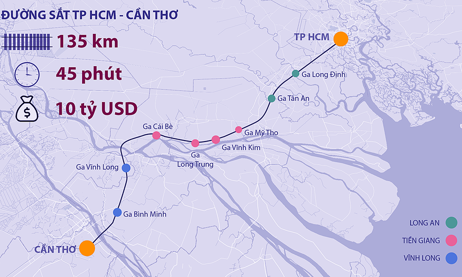 Tuyến đường sắt đi qua 5 tỉnh: TP HCM, Long nhãn, Thiên Giang, Ronglong và Cần T. Theo quy hoạch mới, tuyến dài 135 km, giảm 5 km so với quy hoạch trước đây, thấp hơn một điểm dừng. Nguyên nhân giảm là do điều chỉnh hành lang phải đường cao tốc TP.HCM-Trung Lương-Mỹ Thuận-Cần Thơ.