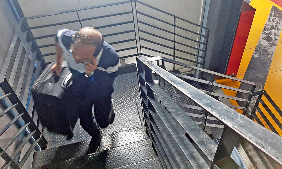 Hành khách có hành lý leo lên tầng 3 nhà xe TCP đón trả xe công nghệ vào tháng 11/2020. Ảnh: Gia Minh.