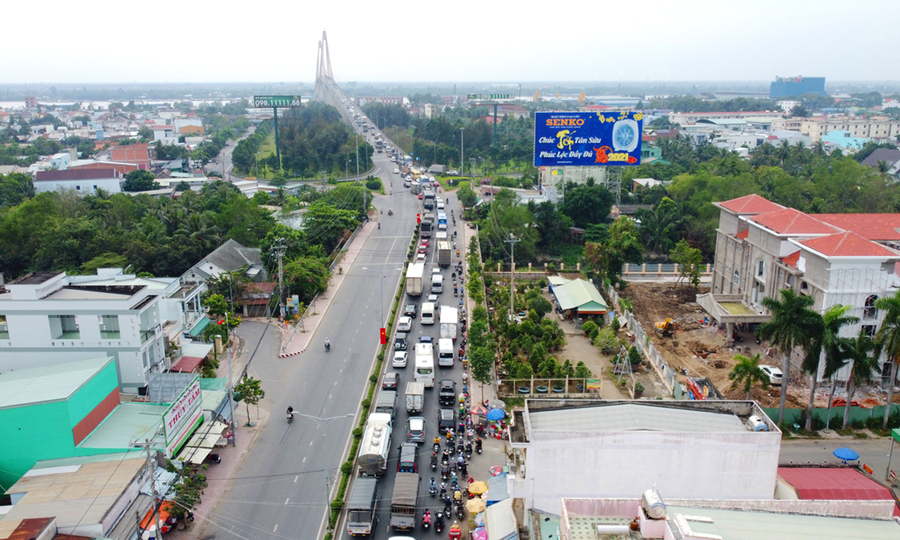 Quốc lộ 60, khoảng cách giữa các ô tô dưới chân cầu Rạch Miễu (thành phố Thiên Hà, thành phố Mai Giang) hơn 2 km, nhưng hướng ngược lại thành phố Hồ Chí Minh rất thông thoáng. Ảnh: Hoàng Nam
