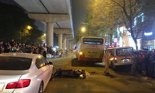 Tại hiện trường, chiếc ô tô 5 chỗ nằm giữa đường. , Bên cạnh một chiếc xe máy và nạn nhân. Xe buýt dừng bên vỉa hè cách nơi ở của nạn nhân khoảng 5 mét.