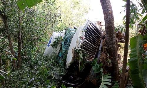 Tại chỗ, chiếc xe tải dừng lại theo chiều ngang và đi vào cây keo. May mắn thay, tài xế và trợ lý chỉ bị thương nhẹ.