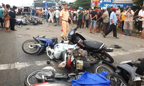 Trước đó, khoảng 3h30 chiều, Phạm Thanh Hiếu (32 tuổi, quê ở Long’an) lái một chiếc máy kéo 1A với hai container 20 feet trên đường cao tốc và đi về hướng tây đến Thành phố Hồ Chí Minh. Tại ngã tư Bình Nhã gần cầu Bình Nhã, tỉnh Long An, chiếc ô tô bất ngờ đâm vào hàng loạt xe máy có đèn đỏ phía trước. -Mô-tô nằm trên hiện trường. Ảnh: Hoàng Nam .