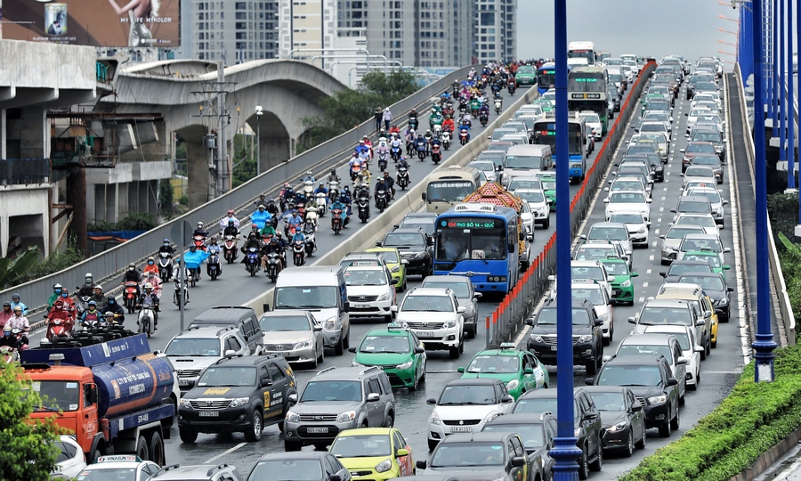 Tính đến 7 giờ sáng, hàng ngàn ô tô đã đậu trên cầu Sài Gòn, từ quận 2 đến quận Bình Thành của thành phố Hồ Chí Minh. Lý do là đường đến Điện Biên Phủ dưới chân cầu Sài Gòn vẫn ngập sâu.