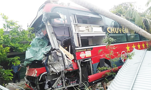 Chiếc xe khách đập nát hai cây dừa. Ảnh: Phúc Trường.