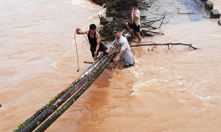 Sáng ngày 3/11, ông Phạm Văn Nam, Chủ tịch Ủy ban nhân dân huyện An cũ (Bình Định) cho biết, trận lụt lớn trên sông Dinh đã phá hủy hai ngôi làng ở thị trấn An Dũng. Nhịp cầu cách ly 1.200 người. -Người dân ở huyện lớn tuổi dùng cây trầu làm cầu tạm sau khi cầu sập. Ảnh: Trọng Lợi .