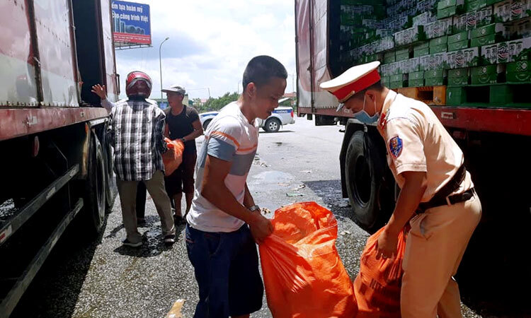 Vụ việc xảy ra trên quốc lộ 1A đoạn qua thị trấn Thạch Long, huyện Thạch Hà. Tài xế Bùi Xuân Dũng, 25 tuổi, ngụ Quảng Bình, điều khiển xe tải hướng Nam – Bắc Đà Nẵng, ôm cua tại bùng binh xã Tahlang thì bị ô tô sau đập cửa, đè lên người. Đặt 100 thùng bia trên đường phố. Hàng nghìn lon bia chất đầy thùng các-tông bị đổ, nhiều thùng bị hư hỏng, rỉ nước. Ảnh: Gia Hân