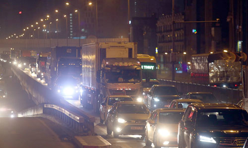 Tai nạn liên hoàn khiến mạng lưới vành đai chắn ngang Quốc lộ 3. Hàng nghìn chiếc ô tô đang chờ đặt gần tòa nhà Keangnam (Nam Từ Liêm, Hà Nội). Cảnh sát giao thông đến đường vòng lúc 10:30 tối.