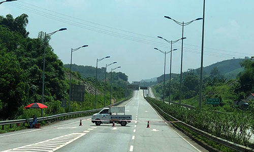 Sáng nay, đơn vị quản lý đường cao tốc Nội Bài-Lào Cai đã lập rào chắn tại nút giao IC12 và IC14. Nhiếp ảnh: Yuemai
