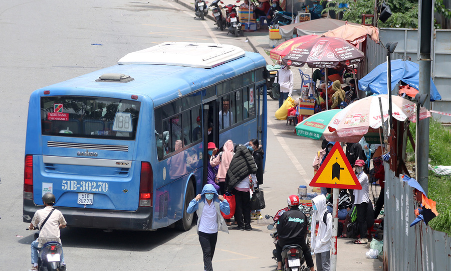 Trước Suối Tiên Bến xe Quốc lộ 1A (Khu 9) trưa 5/8, nhiều người chờ xe dưới cái nắng gay gắt, có nhà chờ nhưng dãy lều tạm bợ cho người bán hàng lấn chiếm hết diện tích, buộc khách phải dắt bộ Chờ xe buýt trên đường, gần đó, bốn điểm dừng khác cũng trong tình trạng tương tự, khi đứng chờ xe, người già, phụ nữ và trẻ em đều đeo khẩu trang, áo khoác, mồ hôi nhễ nhại.