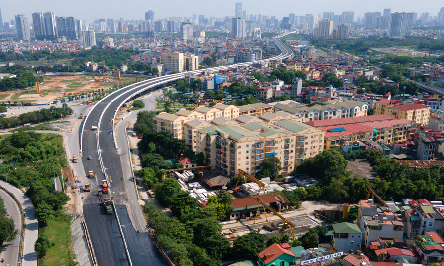 Cầu cạn vành đai 3 dài 5,36 km, tổng mức đầu tư khoảng 5.343 tỷ đồng, bằng nguồn vốn vay ODA của Nhật Bản. Dự án khởi công vào tháng 5/2018. Đây là dự án giao thông quan trọng của Hà Nội sẽ góp phần giải quyết vấn đề ùn tắc giao thông trên tuyến đường vành đai 3 phía Bắc thành phố. Ảnh: Phạm Hùng
