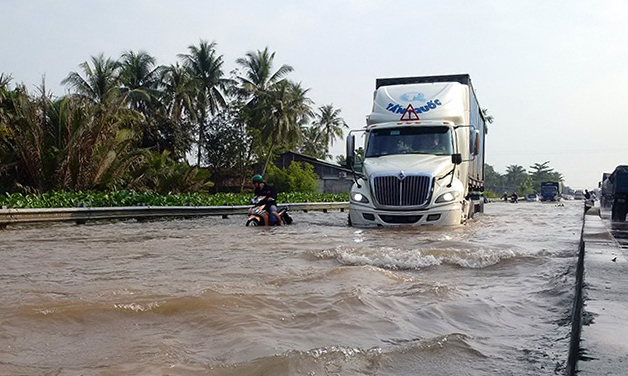 Trong đợt triều cường cuối tháng 9, Quốc lộ 1 qua Vĩnh Long bị ngập nặng. Ảnh: Cửu Long.