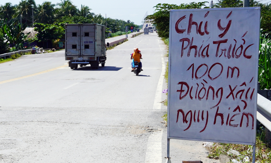 Ngày 19/11, anh Nguyễn Văn Vĩnh Phúc, 48 tuổi, lái xe khách từ Bến Tre đến Trà Vinh trên Quốc lộ 60. Đến chân cầu Tân Điền, anh giảm tốc độ trên cầu Cổ Chiên thuộc thị trấn Thành Thới B, huyện Mỏ Cày Nam, vòng qua nhiều “ổ gà”. Mọi người đứng lên nhắc nhở những người qua đường. Ảnh: Hoàng Nam.
