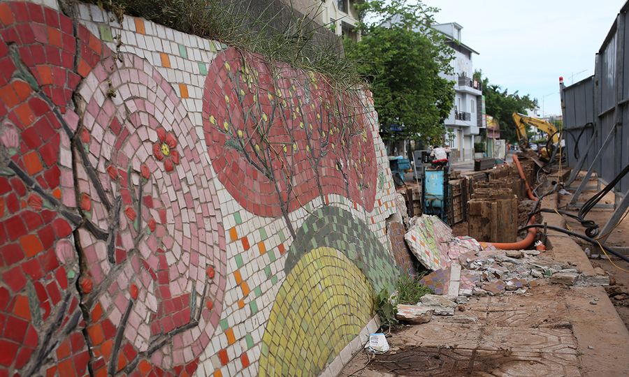 Từ đầu tháng 6, hàng chục công nhân đã lắp hàng rào tại ngã ba Nghi Tàm-Xuân Diệu. Lực lượng truy quét phá bỏ bức tường bê tông gắn tranh, sau đó đào sâu 5 mét để giải phóng phần móng. Đồ gốm với chủ đề “Mùa xuân”, “Phố cổ Bắc Xuân” và “Hà Nội xưa và nay” đã bị phá hủy hoàn toàn, và những đồ gốm đầy màu sắc nằm rải rác trên đường đi. Nút giao thông Nghi Tàm-Xuân Diệu đã được phá bỏ. Ảnh: Tất Định