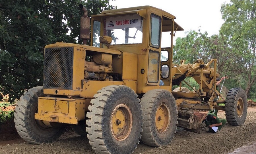 Sáng 20/8, chiếc xe ủi đất làm đường đã cuốn hai mẹ con vào gầm xe máy. Ảnh: Đức Huỳnh.