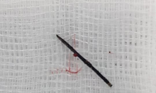 Cuối cùng, bác sĩ cũng rút ra được một chiếc kim khâu màu đen gỉ dài 17mm. Sau 3 ngày phẫu thuật, sức khỏe cháu bé đã ổn định. Ảnh: Bệnh viện cung cấp – – Bác sĩ Hoàng Hải Đức, Trưởng khoa Chỉnh hình Nhi, Bệnh viện Nhi Trung ương cho biết, kim nhỏ, rất sắc, có thể dễ dàng xuyên vào cơ thể mà không gây đau nhiều. Khi đã vào bên trong cơ thể, kim có thể di chuyển đến nhiều bộ phận khác nhau theo chuyển động của bệnh nhân nên việc lấy kim ra trở nên rất khó khăn.