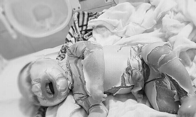Bác sĩ đồng ý điều trị cho trẻ và theo dõi sát tình trạng hô hấp. Bé nằm trong lồng ấp đảm bảo đủ độ ẩm, ăn sữa mẹ trải qua ống thông dạ dày, băng gạc tẩm parafin, bôi thuốc mỡ kháng sinh để dưỡng da. Căn bệnh vảy cá bẩm sinh. Tiếp theo, mẫu máu của trẻ sơ sinh và bố mẹ sẽ được phân tích, đồng thời tiến hành phân tích gen tại Viện Di truyền để đưa ra chẩn đoán chính xác. ” Ảnh có tiêu đề: Do bác sĩ Bệnh viện Đa khoa tỉnh Quảng Bình cung cấp Cháu bé là một phụ nữ 31 tuổi ở tỉnh Vọng, sinh ở tuần thứ 37, cháu bé sinh ra với làn da khô ráp. Rát toàn thân, vảy dày lan ra toàn thân tạo thành nhiều khe hở, chảy máu tại chỗ đứt da, vùng da quanh mắt bị căng khiến mí mắt hướng ra ngoài, không còn nhãn cầu, tai hai bên không bú được, con ạ Phản xạ của cháu còn yếu, ngón tay, ngón chân còn dính bùn, cứng và dính.