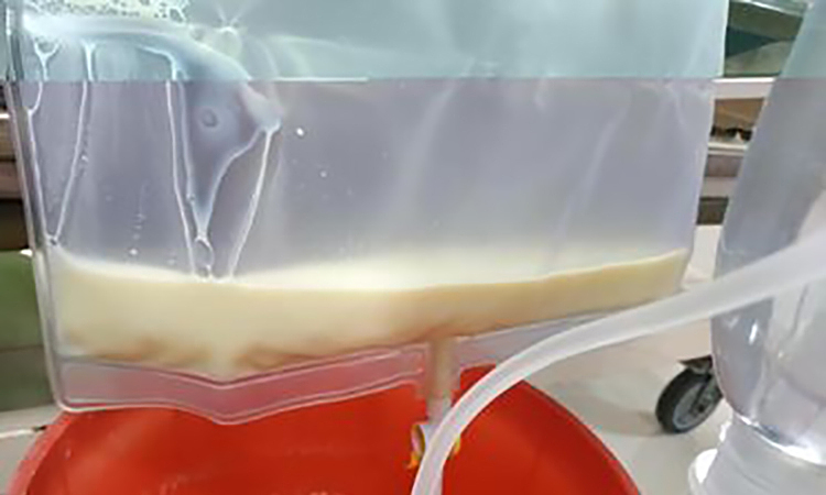 Bệnh nhân lồng ngực vào ngày 14/10 và khó thở, rối loạn nhịp tim tại phòng cấp cứu Bệnh viện Hữu nghị Việt Nam-Cu Ba Đồng Hải. Chỉ số triglycerid là 98,3 mmol / L, trong khi mức bình thường là 1,7 mmol / L. -Bác sĩ xác định, huyết tương của bệnh nhân có màu trắng sữa do tăng mỡ máu. Huyết tương là một thành phần của máu, thường là một chất lỏng trong suốt. Theo dõi liên tục Huyết tương của bệnh nhân có màu trắng sữa. Ảnh: Long Nhật .